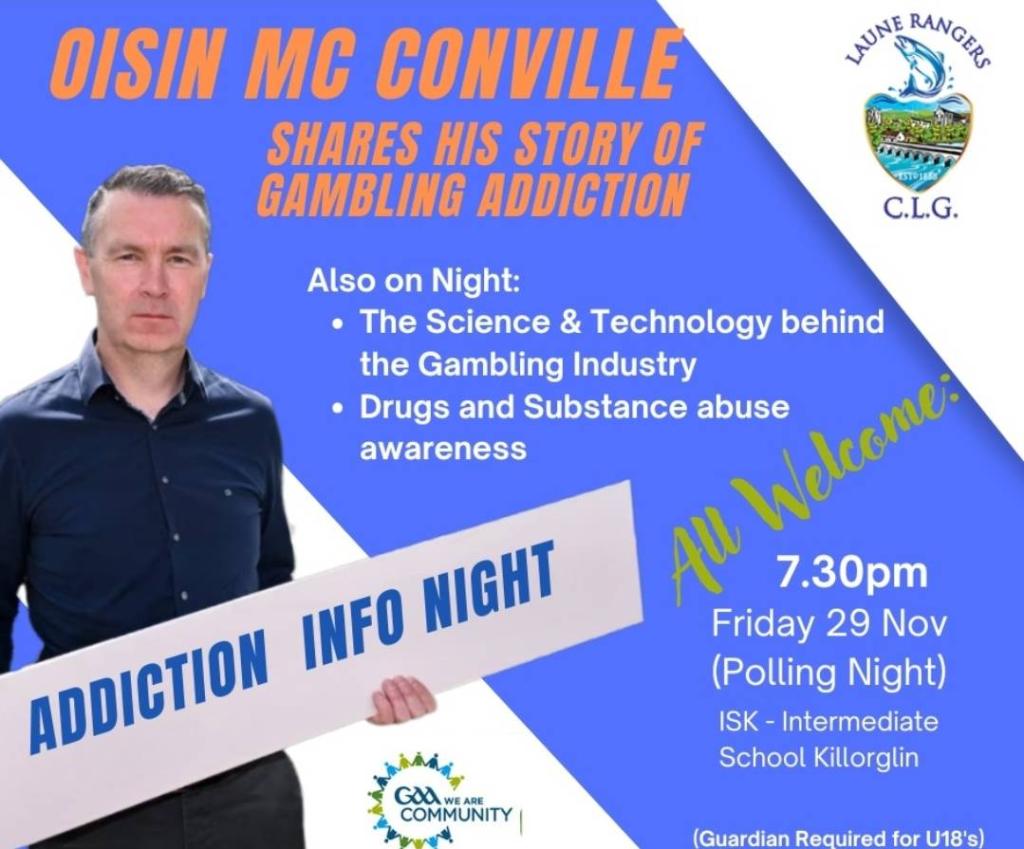 Organised by Laune Rangers GAA Club, the school will host an evening with former Armagh footballer Oisin McConville, who will share his story of gambling addiction on Friday November 29th at 7.30pm. Please see the link below for book: