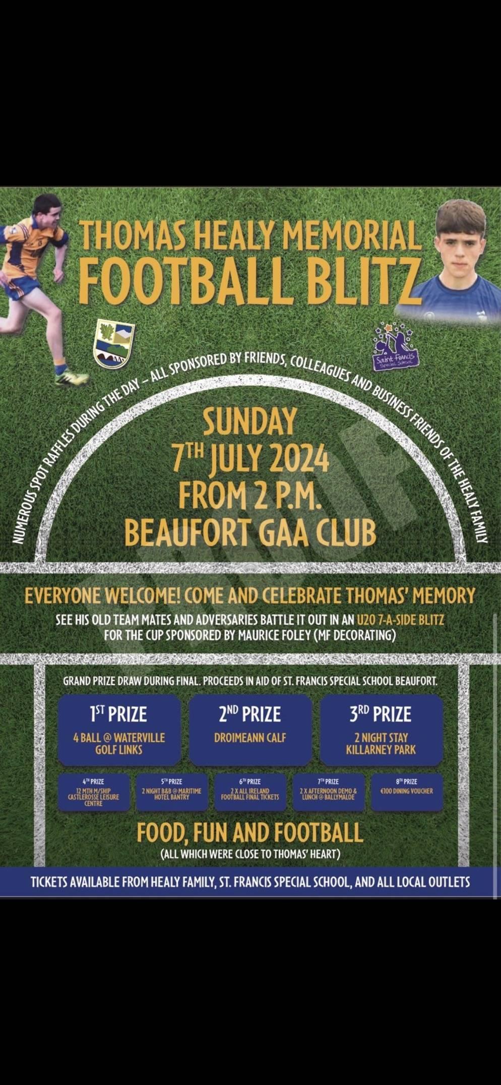 The Healy family are hosting a football blitz in memory of their son Thomas, who was a pupil of the ISK, on Sunday July 7th in Beaufort GAA. Many teams are competing in the tournament beginning at 2pm. There will be entertainment for all and proceeds will go to St. Francis Special School in Beaufort. Please support if you can.